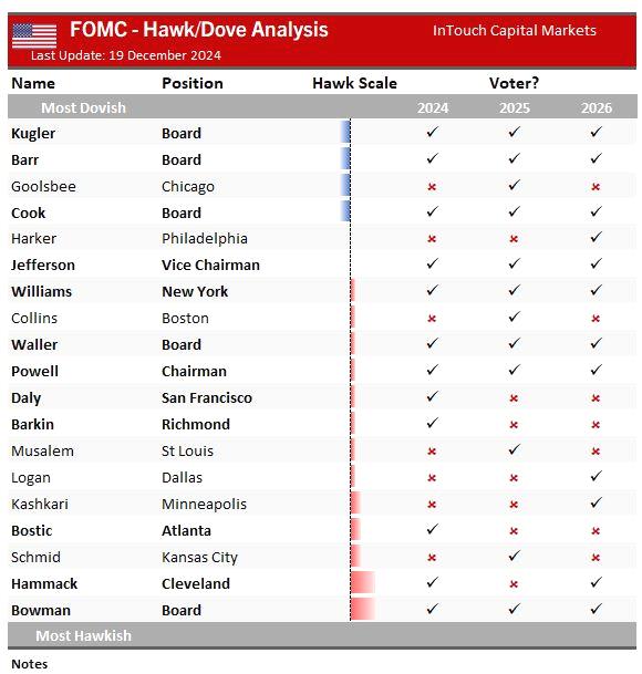 根据InTouch Capital Markets的报告,芝加哥联储主席古尔斯比是这四人中唯一的“鸽派”。该机构将波士顿联储主席柯林斯和圣路易斯联储主席穆萨莱姆列为“轻度鹰派”,而堪萨斯城联储主席施密德则为“中度鹰派”。