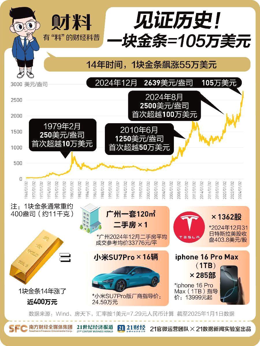 2024年,黄金价格飙升得让人咋舌。你敢信吗?一块重达400盎司的金条,价值竟然超过了105万美元,比2010年翻了一倍还多!14年间,价格涨了55万美元,折合人民币近400万。这涨幅,在广州能买套房,或者换16辆小米SU7Pro汽车,285部iPhone 16 Pro Max(1TB)手机。投资黄金,看来比炒股买基金更明智啊。