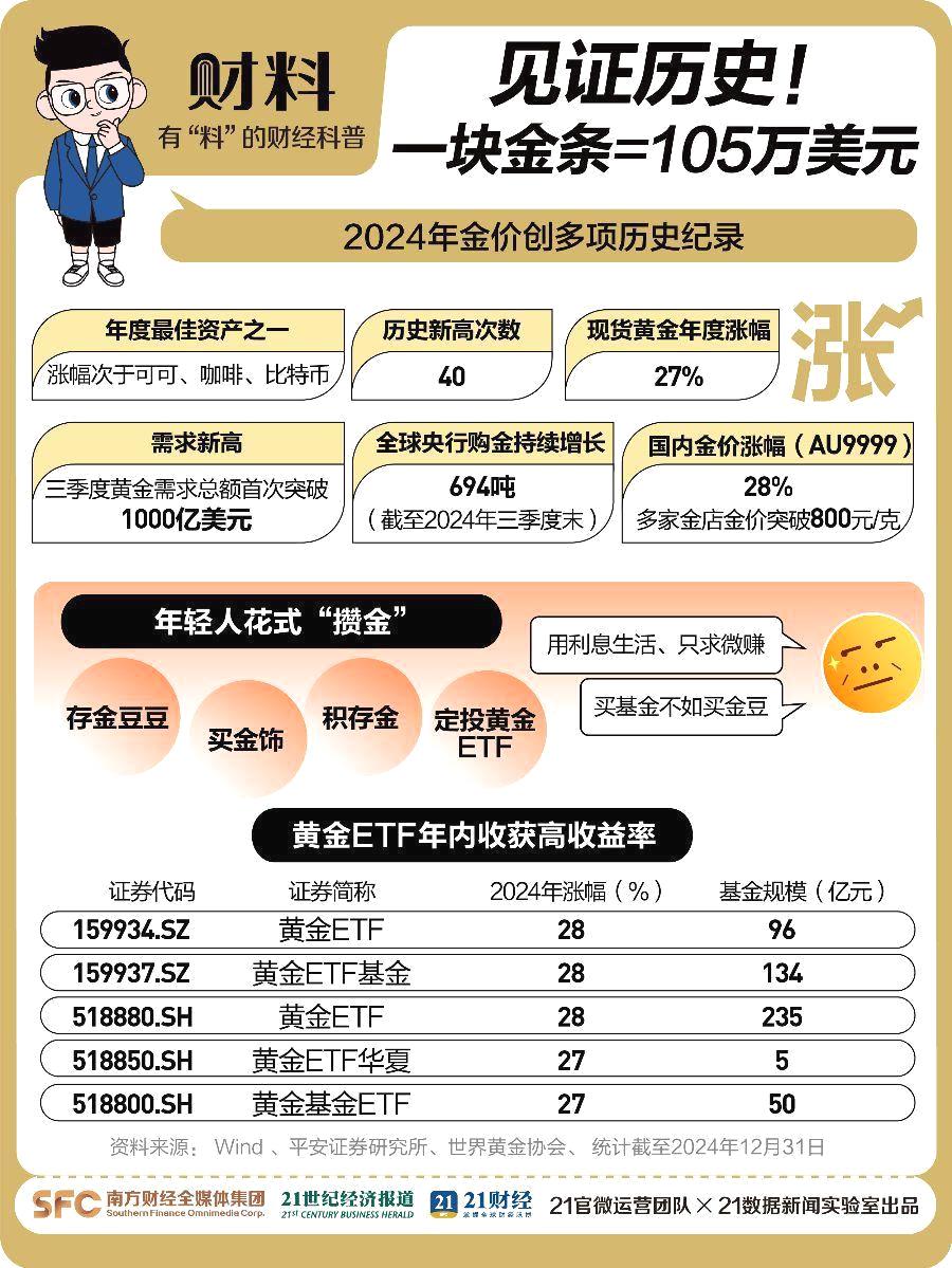 2024年黄金市场还创造了6项历史纪录:成为年度最佳投资之一、价格创新高、实物黄金年度涨幅创新高、国内品牌金饰价格创新高、全球黄金需求创新高、全球央行购金量也创了新高。这一年,有人抓住机会赚了一大笔,也有人满怀激情地想要抄底,希望一夜暴富;年轻人也好像找到了新的方向,纷纷加入黄金市场。《中国黄金首饰市场报告2024》显示:“90后”“00后”已成为黄金首饰主流消费群体,在社交平台上,不少网友评论说“攒钱不如攒金豆豆”“炒股买基金不如买黄金”。