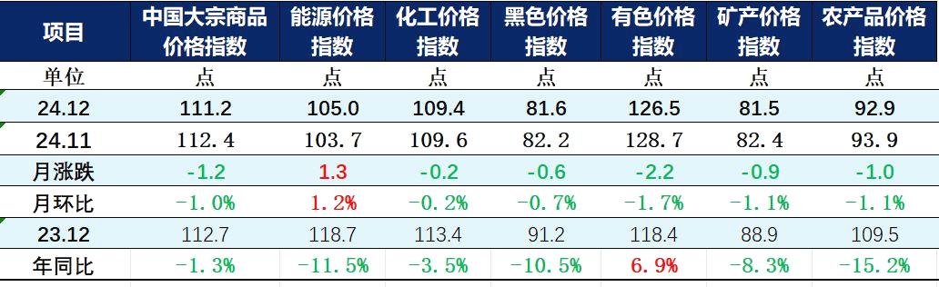 中国物流与采购联合会数据显示,12月矿产价格指数小幅回落,报81.5点,月环比下跌1.1%,年同比下跌8.3%;农产品价格指数有所回落且在低位震荡,报92.9点,月环比下跌1.1%,年同比下跌15.2%。