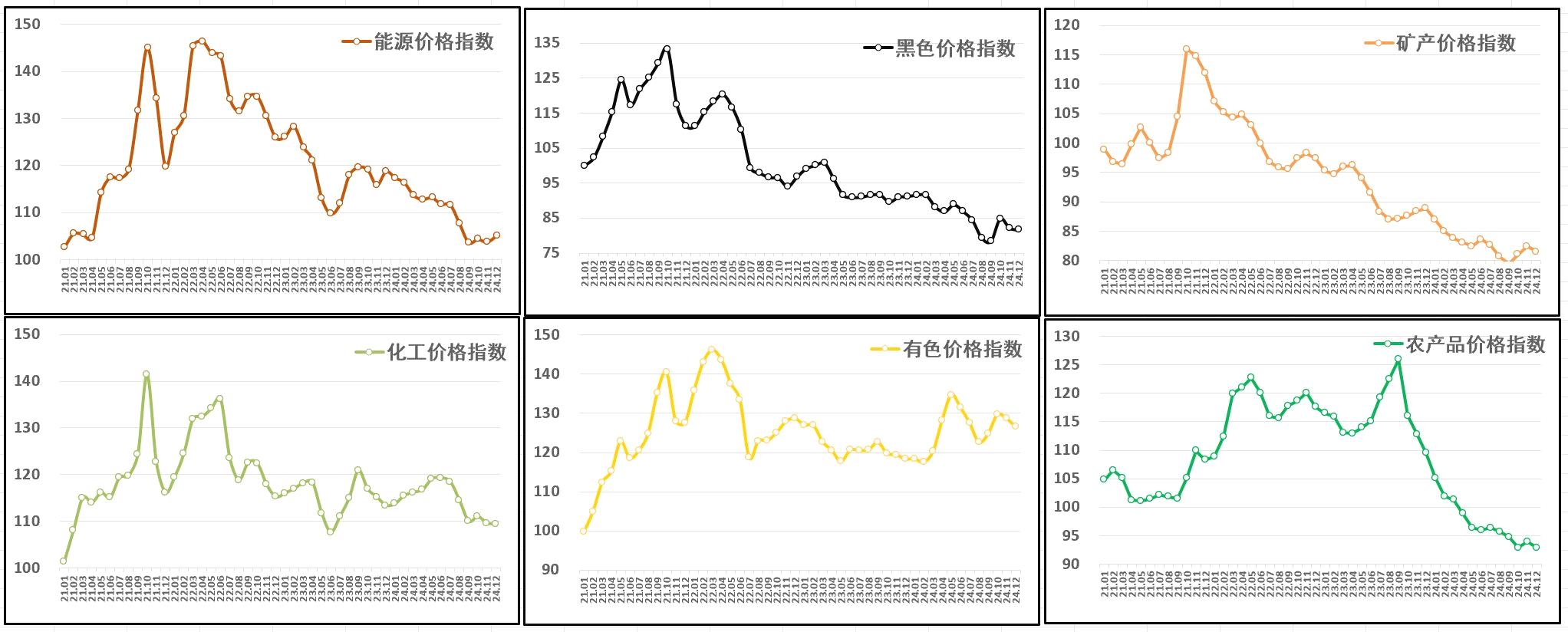 分行业看,12月能源价格指数走高,报105点,月环比上升.1.2%,年同比下跌11.5%;化工、黑色价格指数跌幅收窄,分别报109.4点和81.6点,月环比分别下跌0.2%和0.7%,年同比分别下跌3.5%和10.5%。