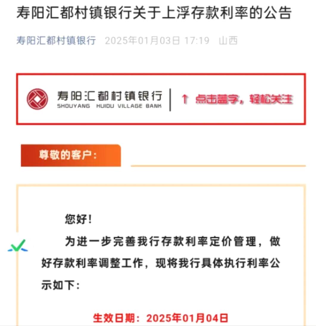 1月3日,寿阳汇都村镇银行发布关于上浮存款利率的公告。自1月4日起,该行一年期、二年期、三年期、五年期定期存款利率分别上调为1.80%、1.85%、2.15%、2.15%。