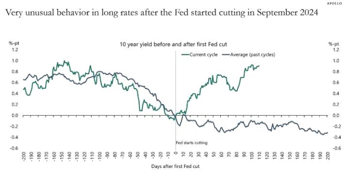 这也意味着自从去年9月开始,美联储降息100个基点的同时,十年期美债收益率上升超过100个基点。