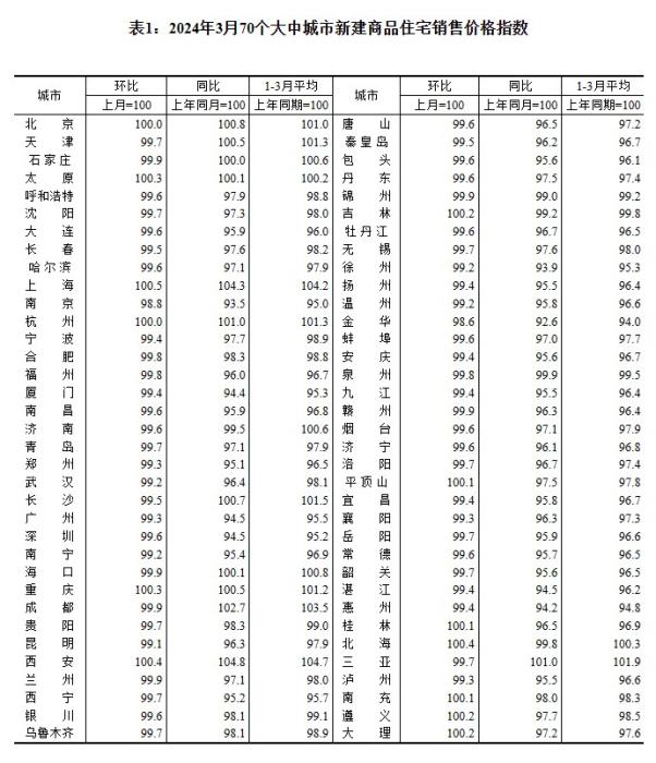 2024年3月70个大中城市新建商品住宅销售价格指数。 截图自国家统计局官网