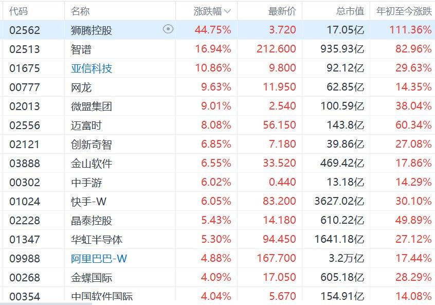 1月14日,港股市场AI概念股继续集体走强,其中,狮腾控股飙升超44%,智谱涨近17%,亚信科技涨近11%,网龙、微盟集团涨超9%,迈富时涨8%,创新奇智、金山软件、中手游、快手-W涨超6%,阿里巴巴-W、金蝶国际、中国软件国际涨超4%。