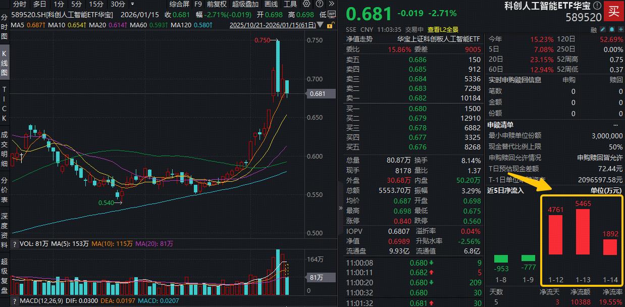 可能是市场整体调整影响了科创人工智能ETF华宝(589520),这支主要投资于国产AI产业链的ETF在周二达到新的历史高点后,今天(1月15日)首次出现回调,场内价格下跌2.71%,回踩5日线,开盘不到半天,成交额已经超过5500万元,交易非常活跃。