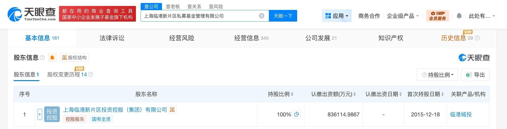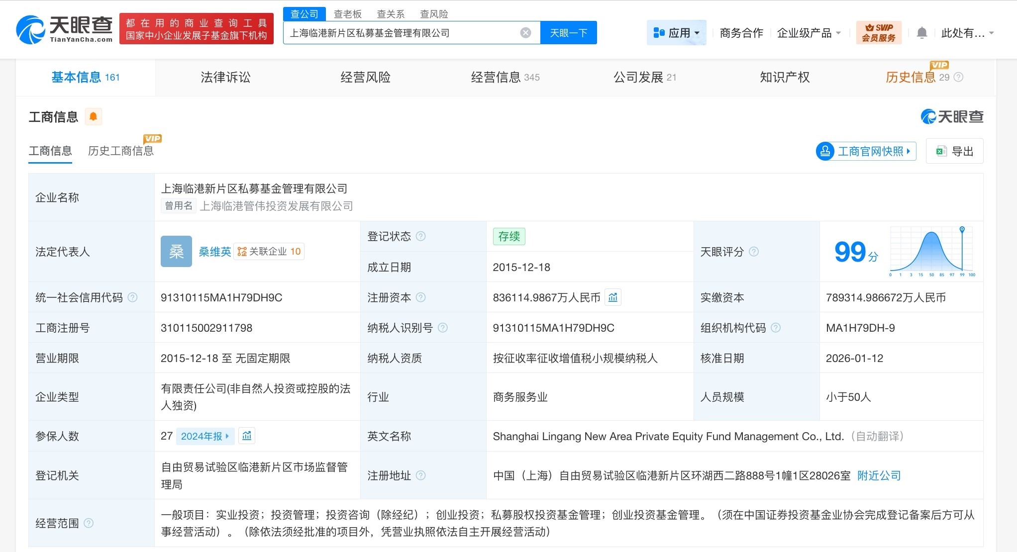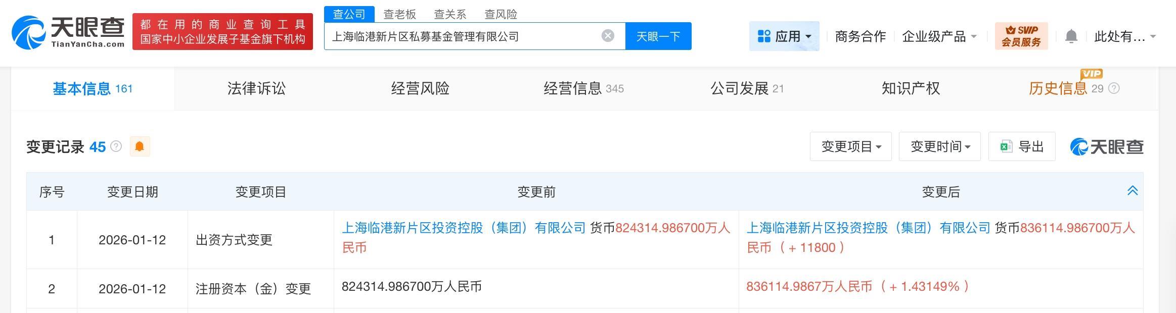 根据天眼查的工商信息,最近上海临港新片区私募基金管理有限公司进行了注册资本的调整,从约82.4亿人民币增加到了约83.6亿人民币。