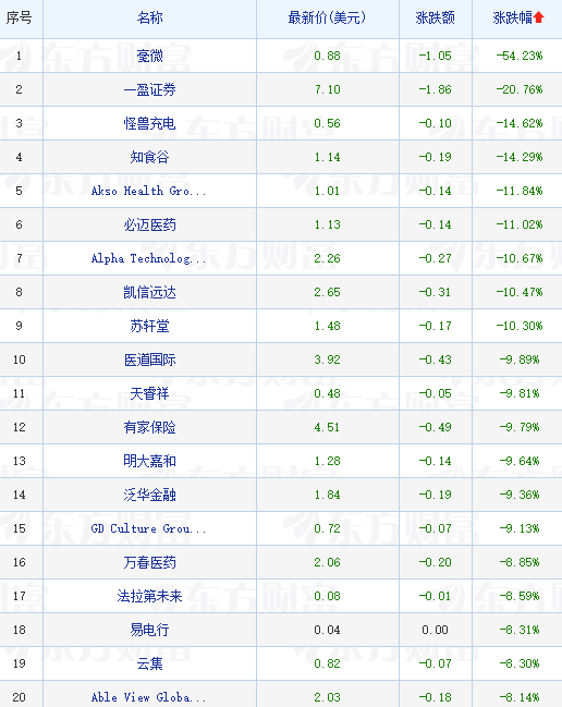 领跌中概股列表: