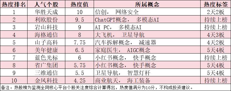 今日,A股十大人气热股如下:华胜天成、利欧股份、岩山科技、海格通信、山子高科、美年健康、蓝色光标、省广集团、三维通信、金风科技。